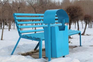 Keywords: bench trash blue container outdoor recycling trashcan metal recycle empty ecology settle form