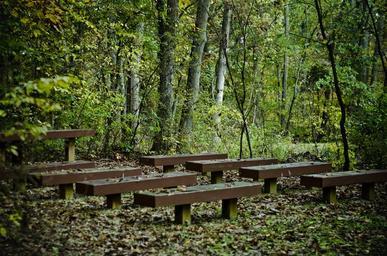 Keywords: benches trees forest green brown mysterious summer leaves dark natural overgrown picnic area picnic ground