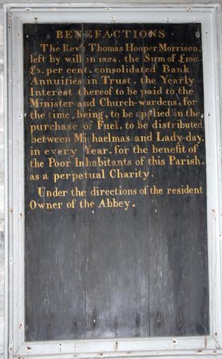 | Keywords: BenefactionsBoard RevThomasHooperMorrison HartlandChurch Devon.JPG en Inscribed board in Tower of St Nectan's Church Hartland Devon publicly proclaiming the benefaction of Rev Thomas Hooper Morrison 1768-1824 of Yeo Vale Alwington Devon who inherited Hartland Abbey from his uncle Paul II Orchard 1739-1812 whose benefactions are similarly recorded on an adjacent board Inscribed Benefactions The Rev<sup>d</sup> Thomas Hooper Morrison left by will in 1824 the sum of £100 £3 per cent Consolidated Bank Annuities in trust the yearly interest thereof to be paid to the Minister and Church-Wardens for the time being to be applied in the purchase of fuel to be distributed between Michaelmas and Lady Day in every year for the benefit of the poor inhabitants of this parish as a perpetual charity Under the directions of the resident owner of the Abbey own photo Lobsterthermidor <span class signature-talk ></span> 15 48 2 April 2015 UTC after 1824 ; photo 2015 PD-old-100 St Nectan's Church Hartland interior |