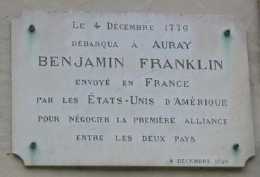 | Keywords: Benjamin Franklin plaque Auray.jpg en Plaque about the arrival of Benjamin Franklin in France in 1776 Auray Morbihan France fr Plaque sur l'arrivée de Benjamin Franklin en France en 1776 Auray Morbihan Own 2007-08-21 Man vyi 4 December Maison 8 quai Franklin Auray Plaques in Morbihan 1776 in Bretagne |