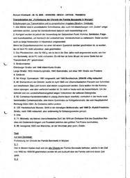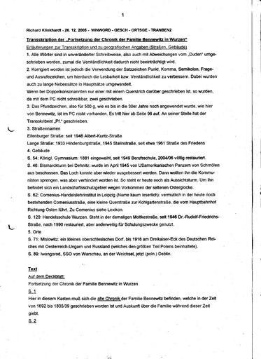 | Keywords: Bennewitz Fortsetzung der Chronik zusammengefasst 0000.jpg Bennewitz - Chronik einer Kürschnerfamilie Abschrift der Seite siehe unten Dieser Teil ist überschrieben mit <br/>Fortsetzung der Chronik der Familie Bennewitz in Wurzen Hier in diesem Kasten muß sich die alte Chronik der Familie Bennewitz befinden welche in der Zeit von 1692 bis 1835/39 geschrieben worden ist und Auskunft über die Familie während dieser Zeit gibt Um die Chronik der Familie Bennewitz deren alte Aufzeichnungen vom Jahre 1692 bis 1835/39 sich in dem Buche befinden welches sich in dem vorhergehenden Kasten befindet fortführen zu können ließ ich dieses Buch anfertigen weil das alte Buch keine alten Blätter mehr hatte <br/> Wurzen im August 1909 Ernst Oskar Bennewitz Neun Generationen Kürschnermeister Bennewitz in Wurzen seit 1652 bis zur Flucht 1952 immer an gleicher Stelle Albert-Kuntz-Straße 1 Ecke Schuhgasse Anschließend in Frankfurt/Main Die zehnte Generation Otto Bennewitz jetzt 2010 in Garmisch-Partenkirchen das Haus ist wieder in Familienbesitz Nachfolgend die nochmalige mit einem Texterkennungsprogramm gelesene unkorrigierte Abschrift der abgebildeten Seite Blatt 1 der Abschrift Richard Klinkhardt “ 26 12 2005 - WINWORD - GESCH - ORTSGE TRANBEN2 Transkription der Fortsetzung der Chronik der Familie Bennewitz in Wurzen Erläuterungen zur Transkription und zu geografischen Angaben Straßen Gebäude 1 Alle Wörter sind in unveränderter Schreibweise also auch mit Abweichungen vom žDuden umgeschrieben worden zumal die Verständlichkeit dadurch nicht beeinträchtigt wird 2 Korrigiert worden ist jedoch die Verwendung der Satzzeichen Punkt Komma Semikolon Frage-und Ausrufezeichen um hierdurch die Lesbarkeit bzw Verständlichkeit zu verbessern Dabei wurden auch zu lange Nebensätze in Hauptsätze umgewandelt Wenn bei Doppelkonsonanten nur einer mit einem Querstrich darüber geschrieben ist so wurden da mit dem PC nicht schreibbar zwei geschrieben 3 Das Pfundzeichen also für 500 g wie es bis in die 1930er Jahre noch angewendet wurde wie hier von Bennewitz ist im PC nicht vorhanden Es tritt hier ab Seite 96 auf An seiner Stelle hat der Transkribent žPf geschrieben 3 Straßennamen Eilenburger Straße seit 1946 Albert-Kuntz-Straße Lange Straße 1933 Hindenburgstraße 1945 Stalinstraße seit etwa 1961 Straße des Friedens 4 Gebäude S 54 König' Gymnasium 1881 eingeweiht seit 1949 Berufsschule 2004/06 völlig restauriert S 46 Bismarckturm bei Dehnitz wurde im April 1945 von USamerikanischen Panzern von Schmölen aus beschossen Das Loch konnte aber wieder ausgebessert werden Dann wollten ihn die Kommunisten sprengen was aber verhindert worden ist So steht er heute noch als Aussichtsturm Um ihn befindet sich ein Landschaftsschutzgebiet wegen Vorkommen der seltenen Osterglocke S 62 Comenius-Handelslehrinstitut in Leipzig Name kaum leserlich vermutlich in der heute noch bestehenden Comeniusstraße eine kleine Querstraße zur Kohlgartenstraße die vom Hauptbahnhof Richtung Osten führt Zu Comenius siehe Lexikon S 120 Handelsschule Wurzen Steht in der damaligen Moltkestraße seit 1946 Dr -Rudolf-Friedrichs- Straße nach 1990 restauriert aber anderweitig für Schulungszwecke genutzt 5 Orte S 71 Mislowitz ein kleines oberschlesisches Dorf bis 1918 am Dreikaiser-Eck des Deutschen Reiches mit Oesterreich-Ungarn und Russland Welches den größten Teil Polens beinhaltete S 89 lwangorod SSO von Warschau an der Weichsel jetzt poln Deblin Text Auf dem Deckblatt Fortsetzung der Chronik der Familie Bennewitz in Wurzen S 1 Hier in diesem Kasten muß sich die alte Chronik der Familie Bennewitz befinden welche in der Zeit von 1692 bis 1835/39 geschrieben worden ist und Auskunft über die Familie während dieser Zeit giebt S 2 seealso category Furriers Bennewitz in Wurzen Germany Weitere Bilder und Familien- und Firmenchronik Furrier family Bennewitz in Wurzen Germany since 1652 Own Begonnen 1909 Bennew <span class signature-talk >talk</span> 15 04 7 June 2010 UTC Fortsetzung der Chronik der Familie Bennewitz in Wurzen Comeniusstraße Leipzig |