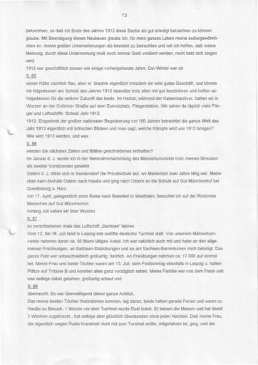 | Keywords: Bennewitz Fortsetzung der Chronik zusammengefasst 0012.jpg Bennewitz - Chronik einer Kürschnerfamilie Abschrift der Seite siehe unten Dieser Teil ist überschrieben mit <br/>Fortsetzung der Chronik der Familie Bennewitz in Wurzen Hier in diesem Kasten muß sich die alte Chronik der Familie Bennewitz befinden welche in der Zeit von 1692 bis 1835/39 geschrieben worden ist und Auskunft über die Familie während dieser Zeit gibt Um die Chronik der Familie Bennewitz deren alte Aufzeichnungen vom Jahre 1692 bis 1835/39 sich in dem Buche befinden welches sich in dem vorhergehenden Kasten befindet fortführen zu können ließ ich dieses Buch anfertigen weil das alte Buch keine alten Blätter mehr hatte <br/> Wurzen im August 1909 Ernst Oskar Bennewitz Neun Generationen Kürschnermeister Bennewitz in Wurzen seit 1652 bis zur Flucht 1952 immer an gleicher Stelle Albert-Kuntz-Straße 1 Ecke Schuhgasse Anschließend in Frankfurt/Main Die zehnte Generation Otto Bennewitz jetzt 2010 in Garmisch-Partenkirchen das Haus ist wieder in Familienbesitz Nachfolgend die nochmalige mit einem Texterkennungsprogramm gelesene unkorrigierte Abschrift der abgebildeten Seite Blatt 13 der Abschrift bekommen so daß ich Ende des Jahres 1912 diese Sache als gut erledigt betrachten zu können glaube Mit Beendigung dieses Neubaues glaube ich für mein ganzes Leben meine außergewöhnlichen ev meine großen Unternehmungen als beendet zu betrachten und will ich hoffen daß meine Meinung durch diese Unternemung muß noch einmal Geld verdient werden recht bald sich zeigen wird 1912 war geschäftlich besser wie einige vorhergehende Jahre Der Winter war ob S 65 seiner Kälte ziemlich flau aber er brachte eigentlich trotzdem ein sehr gutes Geschäft und könnte ich folgedessen am Schluß des Jahres 1912 dasselbe trotz allen mit gut bezeichnen und hoffen wir folgedessen für die weitere Zukunft das beste Im Herbst während der Kaisermanöver hatten wir in Wurzen an der Collmner Straße auf dem Exercirplatz Fliegerstation Wir sahen da täglich viele Flieger und Luftschiffe Schluß Jahr 1912 1913 Eingedenk der großen nationalen Begeisterung vor 100 Jahren betrachtet die ganze Welt das Jahr 1913 eigentlich mit kritischen Blicken und man sagt welche Kämpfe wird uns 1913 bringen Wie wird 1913 werden und was S 66 werden die nächsten Zeilen und Blätter geschriebenes enthalten Im Januar d J wurde ich in der Generalversammlung des Männerturnverein trotz meines Streuben als zweiter Vorsitzender gewählt Ostern d J lößte sich in Sandersdort die Privatschule auf wo Mariechen zwei Jahre tätig war Mariechen kam deshalb Ostern nach Hauße und ging nach Ostern an die Schule auf Gut Münchenhof bei Quedlinburg a Harz Am 17 April gelegentlich einer Reise nach Bielefeld in Westfalen besuchte ich auf der Rückreise Mariechen auf Gut Münchenhof Anfang Juli sahen wir über Wurzen S 67 zu verschiedenen male das Luftschiff žSachsen fahren Vom 12 bis 16 Juli fand in Leipzig das zwölfte deutsche Turnfest statt Von unserem Männerturnverein nahmen daran ca 50 Mann tätigen Anteil Ich war natürlich auch mit und habe an den allgemeinen Freiübungen an Sachsen-Stabübungen und an am Sachsen-Barrenturnen mich beteiligt Das ganze Fest war unbeschreiblich großartig herrlich An Freiübungen nahmen ca 17 000 auf einmal teil Meine Frau und beide Töchter waren am 13 Juli dem Festsonntag ebenfalls in Leipzig u hatten Plätze auf Tribüne B und konnten alles ganz vorzüglich sehen Meine Familie war von dem Feste und was selbige dabei gesehen großartig erbaut und S 68 überrascht Es war überwältigend dieser ganze Anblick Das meine beiden Töchter theilnehmen konnten lag daran beide hatten gerade Ferien und waren zu Hauße zu Besuch 1 Woche vor dem Turnfest wurde Rudi krank Er bekam die Masern und hat damit 3 Wochen zugebracht hat selbige aber glücklich überstanden ohne jeden Nachteil Daß meine Frau die eigentlich wegen Rudis Krankheit nicht mit zum Turnfest wollte mitgefahren ist ging weil die seealso category Furriers Bennewitz in Wurzen Germany Weitere Bilder und Familien- und Firmenchronik Furrier family Bennewitz in Wurzen Germany since 1652 Own Begonnen 1909 Bennew <span class signature-talk >talk</span> 15 04 7 June 2010 UTC Fortsetzung der Chronik der Familie Bennewitz in Wurzen |