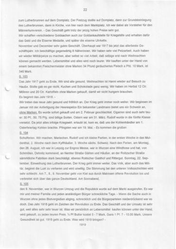 | Keywords: Bennewitz Fortsetzung der Chronik zusammengefasst 0021.jpg Bennewitz - Chronik einer Kürschnerfamilie Abschrift der Seite siehe unten Dieser Teil ist überschrieben mit <br/>Fortsetzung der Chronik der Familie Bennewitz in Wurzen Hier in diesem Kasten muß sich die alte Chronik der Familie Bennewitz befinden welche in der Zeit von 1692 bis 1835/39 geschrieben worden ist und Auskunft über die Familie während dieser Zeit gibt Um die Chronik der Familie Bennewitz deren alte Aufzeichnungen vom Jahre 1692 bis 1835/39 sich in dem Buche befinden welches sich in dem vorhergehenden Kasten befindet fortführen zu können ließ ich dieses Buch anfertigen weil das alte Buch keine alten Blätter mehr hatte <br/> Wurzen im August 1909 Ernst Oskar Bennewitz Neun Generationen Kürschnermeister Bennewitz in Wurzen seit 1652 bis zur Flucht 1952 immer an gleicher Stelle Albert-Kuntz-Straße 1 Ecke Schuhgasse Anschließend in Frankfurt/Main Die zehnte Generation Otto Bennewitz jetzt 2010 in Garmisch-Partenkirchen das Haus ist wieder in Familienbesitz Nachfolgend die nochmalige mit einem Texterkennungsprogramm gelesene unkorrigierte Abschrift der abgebildeten Seite Blatt 22 der Abschrift zum Lutherbrunnen auf dem Domplatz Der Festzug stellte auf Domplatz dann zur Grundsteinlegung des Lutherbrunnen dann in Kirche von hier nach dem Marktplatz Ich war dabei als Vorsteher für den Männerturnverein - Das Geschäft geht trotz der jetzig hohen Preise sehr gut Wir schaffen verschiedene Goldsachen auch zur Goldankaufstelle für Kriegshilfe und erhalten dafür das Geld und die Eiserne Medaille und später die eiserne Uhrkette November und December sehr gutes Geschäft à berhaupt war 1917 bis jetzt das allerbeste Geschäftsjahr Ich beschäftige gegenwärtig 8 Näherinnen Wir haben sehr viel Pelzarbeit Auch haben wir wieder Militärpelze zu machen aber selbst so viel Arbeit daß selbige erst nach Weihnachten können gemacht werden Lebensmittel und alles wird noch teurer Wir kauften unter der Hand von einem bekannten Fleischermeister ohne Marken 34 Pfund geräuchertes Fleisch a Pfd 10 Mark ist 340 Mark S 103 Das Jahr 1917 geht zu Ende Wir sind alle gesund Weihnachten ist Hanni wieder auf Besuch zu Hauße Stolle gab es gar nicht Kuchen und Schokolade ganz wenig Wir haben im Herbst 12 Ctr Möhren und 20 Ctr Kartoffeln ohne Marken gekauft damit wir nicht hungern brauchen Es beginnt das Jahr 1918 - Wir treten das neue Jahr gesund und fröhlich an Der Krieg geht immer noch weiter Wir beginnen im Januar mit der Anfertigung der Heerespelze Ein bekannter Landmann bietet uns ein Schwein an ohne Marken Es wurde sofort gekauft und am 2 Februar geschlachtet Cigarren sind auch sehr teuer 30 Pf 50 75 Pfg sind billige Sorten Ostern war am 31 März Rudolf wurde in die fünfte Klasse versetzt Da jetzt alles infolge Kriegswirt erlaubt ist kam es daß uns der Kohlenhändler am 1 Osterfeiertag Kohlen brachte Pfingsten war am 19 Mai - Es kommen die großen S 104 Schulferien Wir machen Mariechen Rudolf und ich kleine Partien in der ersten Woche in das Muldenthal 2 Woche nach dem Kyffhäußer 3 Woche sächs Schweiz Nach den Ferien am Montag den 26 August ich war in Leipzig zur Engros Messe war in Wurzen eine Windhose und hat von Schmölen Dehnitz kommend an Nemter Straße Gärten und Häußer an der Roitzscher Straße sämmtliche Fabriken stark beschädigt ebenso Roitscher Gasthof und Rittergut Sonntag 22 September Einweihung des Lutherbrunnen Der Krieg geht immer weiter Das Volk aber auch das Militär beginnt die Lust zu verlieren und wird unwillig Die Stimmung bei den unteren Volksschichten wird sehr schlecht Am 7 8 9 November geht von Kiel aus durch Matrosen offene Revolution los und verbreitet sich über das ganze Deutschland Am Sonnabend S 105 den 9 November war in Wurzen Umzug und die Republick wurde auf dem Markt ausgerufen Es war mir und meiner Familie und jeden anständigen Bürger schreckliche Tage - Wenn die Sache auch in Wurzen ohne jedes Blutvergießen abging schrecklich und die Bürgerparteien niederdrückend war es doch Das Jahr 1918 geht im Zeichen der Revolution zu Ende Das Geschäft und der Umsatz ist sehr gut weil alles sehr sehr teuer ist Was wir persönlich an Lebensmittel kaufen können unter der Hand wird gekauft zu jeden teuren Preis 1/2 Pf Butter kostet 5 - 7 Mark Gans 1 Pf 7 - 10 00 Mark Unsere Gesundheit ist gut 1918 geht zu Ende Was wird 1919 bringen ﷓ 1919 seealso category Furriers Bennewitz in Wurzen Germany Weitere Bilder und Familien- und Firmenchronik Furrier family Bennewitz in Wurzen Germany since 1652 Own Begonnen 1909 Bennew <span class signature-talk >talk</span> 15 04 7 June 2010 UTC Fortsetzung der Chronik der Familie Bennewitz in Wurzen |