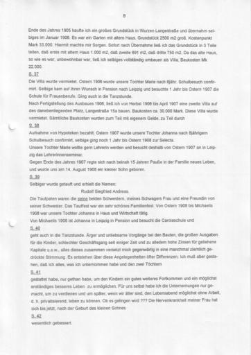 | Keywords: Bennewitz Fortsetzung der Chronik zusammengefasst 0007.jpg Bennewitz - Chronik einer Kürschnerfamilie Abschrift der Seite siehe unten Dieser Teil ist überschrieben mit <br/>Fortsetzung der Chronik der Familie Bennewitz in Wurzen Hier in diesem Kasten muß sich die alte Chronik der Familie Bennewitz befinden welche in der Zeit von 1692 bis 1835/39 geschrieben worden ist und Auskunft über die Familie während dieser Zeit gibt Um die Chronik der Familie Bennewitz deren alte Aufzeichnungen vom Jahre 1692 bis 1835/39 sich in dem Buche befinden welches sich in dem vorhergehenden Kasten befindet fortführen zu können ließ ich dieses Buch anfertigen weil das alte Buch keine alten Blätter mehr hatte <br/> Wurzen im August 1909 Ernst Oskar Bennewitz Neun Generationen Kürschnermeister Bennewitz in Wurzen seit 1652 bis zur Flucht 1952 immer an gleicher Stelle Albert-Kuntz-Straße 1 Ecke Schuhgasse Anschließend in Frankfurt/Main Die zehnte Generation Otto Bennewitz jetzt 2010 in Garmisch-Partenkirchen das Haus ist wieder in Familienbesitz Nachfolgend die nochmalige mit einem Texterkennungsprogramm gelesene unkorrigierte Abschrift der abgebildeten Seite Blatt 7 der Abschrift S 31 Im Herbst 1898 baute ich mein Schaufenster größer Kostenpunkt 2000 Mark Ostern 1899 wurde unser Töchterlein Johanna ebenfalls zur I Bürgerschule geführt Zu Pfingsten 1899 wurde Brunnenbaumeister Mai beim Schützenfest König Selbiger war ein Freund und Schulkamerad von mir und lud mich als Minister dazu ein Wir haben da bis Pfingsten 1900 ein vorzügliches Freudenvolles schönes Jahr verlebt Bis jetzt jedenfalls eins der schönsten Nach Pfingsten 1900 ließ ich den alten Torweg wegreißen und S 32 neu aufbauen zur Vergrößerung der Wohnungen Unsere Wohnungen bekamen neue Fenster u s w Verbesserungen Kostenpunkt Mark 9000 Im Herbst kaufte ich in Naunhof ein Feldgrundstück Zwei Jahre darauf verkaufte selbiges an den Rath der Stadt Leipzig Im Monat April / Mai 1902 war unser Töchterlein Mariechen sehr schwer krank an Nierenentzündung selbige war bereits für Tod erklärt wurden Die Krankheit wurde aber mit Gottes Hilfe wieder gehoben und das Kind wurde nach 1/4 Jahr wieder gesund Zur Stärkung S 33 der Gesundheit zur Erholung und vielleicht auch zu unserem Vergnügen reisten wir in den großen Ferien 1902 d h meine Frau ich und unsere zwei Kinder nach Ahlbeck an der Ostsee Wir hielten uns auf dieser Reise in Berlin Stettin u s w auf und blieben in Ahlbeck ca 3 1/2 Wochen Eine herrliche Zeit Nachdem wir wieder nach Hause kamen besserte sich der Gesundheitszustand von Mariechen immer mehr und hat die Krankheit jedenfalls keine schädlichen Folgen hinterlassen 1903 nach Neujahr wurde leider mein Schwiegervater krank selbiger S 34 feierte am 23 März 1903 sein 50jähriges Arbeitsjubiläum in der Wurzner Tapetenfabrik Er konnte leider diesen Tag nur als kranker Mann in seiner Wohnung begehen wurde immer weniger und starb am 3 August 1903 Das war wieder ein Schlag spez für meine Frau welche immer noch sehr schwer nervenkrank war und verschlimmerte sich deren Zustand ganz bedenklich Das Geschäft ging während dieser Zeit gut Michaelis 1903 ließen wir S 35 unser Mariechen in die höhere Schule gehen Von Ostern 1904 an kam auch Johanna in die höhere Schule In den Sommerferien 1904 waren wir in Bad Steben in Baiern Meine Schwiegermutter fuhr auch einige Tage dahin nachdem ich zurück war und holte Frau und Kinder ab Die Krankheit meiner Frau besserte sich etwas In den Sommerferien 1905 waren meine Frau und Kinder wieder in Bad Steben Im Herbst 1905 hatte mein Schwager in Leipzig Hochzeit Er hatte sich vorher in Leipzig ein Geschäft gekauft S 36 seealso category Furriers Bennewitz in Wurzen Germany Weitere Bilder und Familien- und Firmenchronik Furrier family Bennewitz in Wurzen Germany since 1652 Own Begonnen 1909 Bennew <span class signature-talk >talk</span> 15 04 7 June 2010 UTC Fortsetzung der Chronik der Familie Bennewitz in Wurzen |