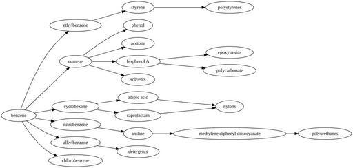 | Keywords: Benzene chemical production network.svg Petrochemical Produced using Graphviz Source code is below <pre>digraph G rankdir LR benzene -> ethylbenzene ethylbenzene -> styrene styrene -> polystyrenes benzene -> cumene cumene -> phenol cumene -> acetone cumene -> bisphenol A bisphenol A -> epoxy resins bisphenol A -> polycarbonate cumene -> solvents benzene -> cyclohexane cyclohexane -> adipic acid adipic acid -> nylons cyclohexane -> caprolactam caprolactam -> nylons benzene -> nitrobenzene nitrobenzene -> aniline aniline -> methylene diphenyl diisocyanate methylene diphenyl diisocyanate -> polyurethanes benzene -> alkylbenzene alkylbenzene -> detergents benzene -> chlorobenzene </pre> own Mr3641 2010-10-25 Chemical processes Benzene |
