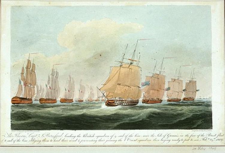 | Keywords: Beresford vs Willaumez 1809.jpg en The Theseus Captn J Beresford leading the British squadron of 4 sail of the line near the Isle of Grouais in the face of the Brest fleet of 8 sail of the line obliging them to haul their wind preventing their joining the l' Orient squadron then laying ready to put to sea Feby 24th 1809; coloured aquatint http //www nmm ac uk/collections/prints/viewPrint cfm ID PAD5776 NMM PAD5776 Sir J Beresford artist; Frederick Christian Lewis engraver PD-old PD-old Jean-Baptiste Philibert Willaumez Naval battles of the Napoleonic Wars |