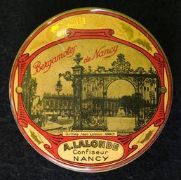 Keywords: Bergamotes de Nancy sweet tin, A Lalonde confiseur.JPG Very old product that is not produced and not sold any more Note that some tins may look the same but when looked for carefully there are some slight differences For more info see http //www tincollectors nl/ tincollectors nl or email info tincollectors nl own 2014-10-31 13 23 29 Alf van Beem CC-zero Trademarked Bergamotes de Nancy Sweets tins