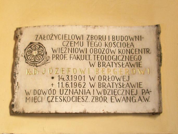 | Keywords: Berger plaque.JPG en Plaque commemorating superintendent Józef Berger in Lutheran Church in Český Těšín Na nivách pl Tablica upamiętniająca superintendenta Józefa Bergera w kościele ewangelickim Na Niwach w Czeskim Cieszynie cs Pamětní deska připomínající superintendenta Józefa Bergera v evangelickém kostele v Českém Těšíně Na nivách own own photo Qasinka 08/11/2008 Plaques in Český Těšín Polish inscriptions in the Czech Republic Lutheranism Superintendents ecclesiastical Berger | ||||