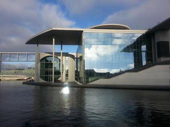 Keywords: berlin government district capital bundestag building architecture spree housewife mirroring reflection modern discs facade water germany