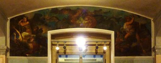 | Keywords: Berlin Neues Museum vaterländischer Saal Drachen restored.jpg de Wandgemälde von Gustav Heidenreich im Vaterländischen Saal des Neuen Museums Berlin Vier Wassernixen lagern links am Seeufer Die liegende Nixe im Vordergrund pflückt Zweige von herabhängenden Blätterranken Daneben stützt sich eine zweite auf ihre Harfe Die beiden Nixen im Hintergrund schauen versonnen über den See Das mittlere Bildfeld zeigt einen Drachen im Greifengestalt mit Adlerkopf Adlerschwingen und Löwenkörper Fauchend und mit ausgebreiteten Flügeln wacht er über einen Schatz aus Helm Schild Schwert Krone Ringen und Münzen Auf der rechten Seite kämpfen zwei Riesen mit einem Drachen Sie versuchen ihm Felsbrocken in das aufgerissene Maul zu werfen Museumstext en Fresco by Gustav Heidenreich illustrating Norse mythology in the Fatherland Hall of the New Museum Berlin On the left four water nixes loll at a lakeshore The reclining nix in the foreground is picking branches from hanging leafy boughs Beside her a second nix is propped on her harp The two nixes in the background gaze pensively across the lake The central field shows a dragon in the shape of a griffon with an eagle's head eagle wings and a lion's body Hissing and with wings spread he guards over a treasure comprising a helmet a shield a sword a crown rings and coins On the right side two giants combat a dragon They are trying to throw boulders into its open maw photo of fresco in the Neues Museum Berlin file James Steakley; artwork Gustav Heidenreich 1852 thumb left 500px Fresco in 2000 prior to its restoration PD-Art Gustav Heidenreich Interior of the Neues Museum Berlin Nixes Creatures in Norse mythology |