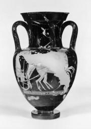 | Keywords: Berlin Painter - Amphora with Chariot and Driver - Walters 482235 - Side A.jpg This red-figure doubleen depicts a charioteer driving biga to the right Bearded he wears a belted xystis and leans forward to urge on the two horses; the lower part of a goad he holds is preserved The horses gallop right heads held up high front legs well off the ground On the back a bearded mantled man wears a fillet He stands to the left right arm extended ca 490 480 BC early Classical terracotta cm 30 3 18 1 h x max diam ; at rim cm 13 5 diam ; at foot cm 8 1 diam accession number 48 2235 20732 E Hollis Hopkins date and mode of acquisition unknown Walters Art Museum 1961 by purchase Museum purchase with funds provided by the S and A P Fund 1961 place of origin Attica Greece Walters Art Museum license Ancient Greek red-figure pottery in the Walters Art Museum Berlin Painter Media contributed by the Walters Art Museum needs category review Media contributed by the Walters Art Museum needs artist update |