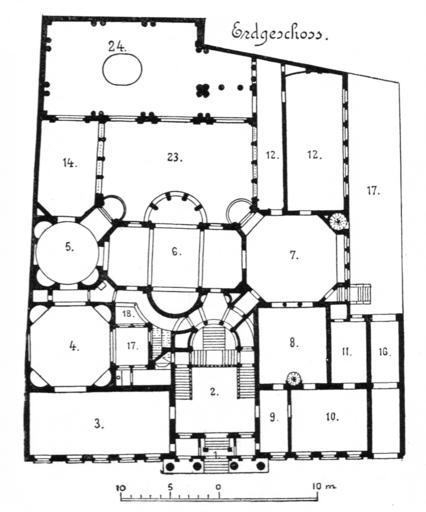 | Keywords: Berlin Palais Strousberg Grundriss Erdgeschoss.jpg Berlin - Ground floor plan of the Palais Strousberg at 70 Wilhelmstraße <small> 1 Entrance 2 Vestibule 3 Reception room 4 Ballroom 5 Boudoir 6 Dining room 7 Billiards room 8 Library 9 Antechamber 10 Ambassadors work room11 Bedroom 12 Art gallery 14 Antechamber 16 Passage 17 Courtyard with glazed roof 18 Buffet room 23 Courtyard 24 Great ballroom </small> Berlin - Grundriss Erdgeschoss Palais Strousberg an der Wilhelmstraße 70<br> <small>Grundriss Erdgeschoss <br> 1 Vorhalle 2 Vestibül 3 Empfangszimmer 4 Tanzsaal 5 Boudoir 6 Speisesaal daneben im Obergeschoss Schlafzimmer 7 Billardzimmer 8 Bibliothek 9 Vorzimmer10 Arbeitszimmer des Botschafters 11 Schlafzimmer 12 Bildergalerie 14 Vorzimmer zum Festsaal 16 Durchfahrt 17 Höfe mit Glasüberdachung 18 Anrichtezimmer 23 Hof 24 Großer Festsaal </small> Berlin und seine Bauten Verlag Wilhelm Ernst Sohn 1896 1896 August Orth PD-old Palais Strousberg |