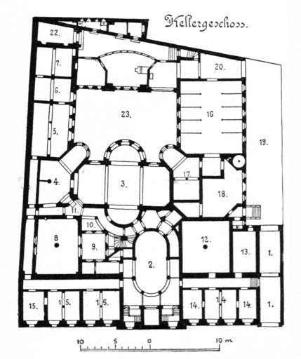| Keywords: Berlin Palais Strousberg Grundriss Kellergeschoss.jpg Berlin - plan basement of palais Strousberg at Wilhelmstraße 70 <small> 1 Passage 2 Servants dinning room 3 Kitchen 4 utility room 5 Laundry room with washing machine 6 Ironing room 7 Mangle room 8 Larder 9 Lightwell 10 Washroom 11 Elevator 12 Boiler room 13 Wine cellar 14 Coachmans accomodation 15 Servants room 16 Stable 17 Crockery room 18 Larder 19 Covered courtyard Coachhouse 20 Passage 22 Grotto 23 Courtyard </small> Berlin - Grundriss Kellergeschoss Palais Strousberg an der Wilhelmstraße 70<br> <small>Grundriss Kellergeschoss </small><br> <small>1 Durchfahrt 2 Speisezimmer der Dienerschaft 3 Küche 4 Wirtschaftsraum 5 Waschküche mit Waschmaschine 6 Plättstube 7 Rollkammer 8 Speisekammer 9 Lichthof 10 Spülraum 11 Aufzug 12 Warmwasserheizung 13 Weinkeller 14 Kutscherwohnung 15 Dienerzimmer 16 Pferdestall 17 Geschirrkammer 18 Futterkammer 19 à berdeckter Hof Wagenremise 20 Durchgang 22 Grotte 23 Hof </small> Berlin und seine Bauten Verlag Wilhelm Ernst Sohn 1896 1896 August Orth PD-old Palais Strousberg Floor plans |