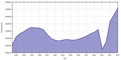 | Keywords: Berlin population3.svg en Berlin's population 1989-2015 de Einwohnerentwicklung von Berlin seit 1989 ValidSVG Berlin_population svg 50 Berlin_population svg Gorgo derivative work Gorgo 2013-01-27 19 06 UTC thumb left thumb left thumb left thumb left Gnuplot script to generate this plot gnuplot <source lang gnuplot > /usr/bin/gnuplot gnuplot 4 2 / Ubuntu 8 10 input set timefmt d m Y set datafile separator ; output unset key set style data lines set style fill transparent solid 0 4 set grid set xdata time set xlabel 'Jahr' set xrange '01 01 1989' '31 12 2015' set xtics 63072000 set mxtics 2 set format x ' Y' set ylabel 'Einwohnerzahl' set ytics 50000 set yrange 3300000 set format y ' 0f' set term svg size 800 400 font Arial 10 set output 'berlin_population3 svg' plot '-' using 1 2 with filledcurves below x1 lt rgb 'dark-blue' lw 2 30 06 1220;2400 30 06 1250;2000 30 06 1300;4000 30 06 1400;7000 30 06 1450;7000 30 06 1450;8000 30 06 1576;11000 30 06 1600;9000 30 06 1618;12000 30 06 1631;8100 30 06 1642;7500 30 06 1648;6000 30 06 1680;10000 30 06 1685;17000 30 06 1688;18000 30 06 1688;20000 30 06 1709;55196 30 06 1712;61000 30 06 1721;65300 30 06 1726;72000 30 06 1730;72387 30 06 1732;77993 30 06 1733;79017 30 06 1735;86000 30 06 1740;90000 30 06 1746;97000 30 06 1747;107224 30 06 1748;107635 30 06 1749;110933 30 06 1750;113289 30 06 1751;116483 30 06 1752;119224 30 06 1753;122897 30 06 1754;125385 30 06 1755;126661 30 06 1756;99177 30 06 1757;94219 30 06 1758;92356 30 06 1759;94433 30 06 1760;95245 30 06 1761;98238 30 06 1762;98090 30 06 1763;119219 30 06 1764;122667 30 06 1765;125139 30 06 1766;125878 30 06 1767;127140 30 06 1768;130359 30 06 1769;132365 30 06 1770;133520 30 06 1771;133639 30 06 1772;131126 30 06 1773;132204 30 06 1774;134414 30 06 1775;136137 30 06 1776;137468 30 06 1777;140719 30 06 1778;124963 30 06 1779;138225 30 06 1780;140625 30 06 1781;142375 30 06 1782;143098 30 06 1783;144224 30 06 1784;145021 30 06 1785;146647 30 06 1786;147338 30 06 1787;146167 30 06 1788;149274 30 06 1789;149875 30 06 1790;150803 30 06 1791;155211 30 06 1792;157534 30 06 1793;157121 30 06 1794;157603 30 06 1795;156218 30 06 1796;160733 30 06 1797;164978 30 06 1798;169019 30 06 1799;169510 30 06 1800;172132 30 06 1801;176709 30 06 1802;177029 30 06 1803;178309 30 06 1804;182157 30 06 1805;155706 30 06 1806;155000 30 06 1807;150489 30 06 1808;145941 30 06 1809;151119 30 06 1810;162971 30 06 1811;169763 30 06 1812;171000 30 06 1813;178641 30 06 1814;185659 30 06 1815;197717 30 06 1816;197817 30 06 1817;195689 30 06 1818;198125 30 06 1819;201138 30 06 1820;201900 30 06 1821;205965 30 06 1822;209146 01 12 1825;220277 01 12 1828;236830 01 12 1831;248682 03 12 1834;265122 03 12 1837;283722 03 12 1840;330230 03 12 1843;353149 03 12 1846;408502 03 12 1849;423902 03 12 1852;438958 03 12 1855;447483 03 12 1858;458637 03 12 1861;547571 03 12 1864;632749 03 12 1867;702437 01 12 1871;826341 01 12 1875;966858 31 12 1876;980194 31 12 1877;1008566 01 12 1880;1122330 01 12 1885;1315287 01 12 1890;1578794 02 12 1895;1677304 01 12 1900;1888848 31 12 1901;1893941 31 12 1902;1911628 31 12 1903;1946076 31 12 1904;1988742 01 12 1905;2040148 31 12 1906;2073521 31 12 1907;2076437 31 12 1908;2057274 31 12 1909;2057610 01 12 1910;2071257 31 12 1911;2084045 31 12 1912;2095030 31 12 1913;2079156 31 12 1914;1945684 31 12 1915;1835094 01 12 1916;1771491 05 12 1917;1744085 31 12 1918;1748000 08 10 1919;1902508 31 12 1919;1928432 31 12 1920;3879409 31 12 1921;3914151 31 12 1922;3953920 31 12 1923;3918985 31 12 1924;3986458 16 06 1925;4024286 31 12 1925;4082778 31 12 1926;4125824 31 12 1927;4195725 31 12 1928;4272375 31 12 1929;4328760 31 12 1930;4332834 31 12 1931;4314466 31 12 1932;4273701 16 06 1933;4242501 31 12 1933;4221024 31 12 1934;4218332 31 12 1935;4226584 31 12 1936;4267560 31 12 1937;4314432 31 12 1938;4347875 17 05 1939;4338756 31 12 1939;4330640 31 12 1940;4330810 31 12 1941;4383882 31 12 1942;4478102 31 12 1943;4430204 31 12 1944;4361398 12 08 1945;2807405 31 12 1945;3064629 29 10 1946;3170832 31 12 1946;3213966 31 12 1947;3271179 31 12 1948;3312307 31 12 1949;3328193 31 12 1950;3336026 31 12 1951;3351865 31 12 1952;3374178 31 12 1953;3367406 31 12 1954;3350957 31 12 1955;3343182 31 12 1956;3345650 31 12 1957;3338561 31 12 1958;3316353 31 12 1959;3290333 31 12 1960;3274016 31 12 1961;3252691 31 12 1962;3235231 31 12 1963;3251489 31 12 1964;3270959 31 12 1965;3274500 31 12 1966;3265398 31 12 1967;3245325 31 12 1968;3225354 31 12 1969;3218112 31 12 1970;3208719 31 12 1971;3172902 31 12 1972;3152489 31 12 1973;3136776 31 12 1974;3118134 31 12 1975;3083011 31 12 1976;3056973 31 12 1977;3044968 31 12 1978;3038689 31 12 1979;3042504 31 12 1980;3048759 31 12 1981;3050974 31 12 1982;3042612 31 12 1983;3040035 31 12 1984;3045456 31 12 1985;3075670 31 12 1986;3115473 31 12 1987;3273630 31 12 1988;3352848 31 12 1989;3409737 31 12 1990;3433695 31 12 1991;3446031 31 12 1992;3465748 31 12 1993;3475392 31 12 1994;3472009 31 12 1995;3471418 31 12 1996;3458763 31 12 1997;3425759 31 12 1998;3398822 31 12 1999;3386667 31 12 2000;3382169 31 12 2001;3388434 31 12 2002;3392425 31 12 2003;3388477 31 12 2004;3387828 31 12 2005;3395189 31 12 2006;3404037 31 12 2007;3416255 31 12 2008;3431675 31 12 2009;3442675 31 12 2010;3460725 31 12 2011;3326002 31 12 2012;3375222 31 12 2013;3517424 31 12 2014;3562166 31 12 2015;3610156 </source> Cc-zero Temporal population graphs of Berlin Images with Gnuplot source code |
