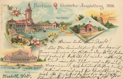 | Keywords: Berlin, Treptow, Gewerbeausstellung 1896, Restaurant, Theater und Kolonial.jpg en old picture postcard of Berlin industrial exhibition 1896 in Treptower Park - view of main restaurant with water tower colonial exhibition and theater Alt-Berlin de alte Ansichtskarte zur Berliner Gewerbeausstellung 1896 im Treptower Park - Ansicht des Hauptrestaurants mit Wasserturm der Kolonial-Ausstellung und dem Theater Alt-Berlin http //www digitale-bibliothek de/scripts/ts dll s 6 id 1EBE9D6B mp /art/1722/ sc Deutschland htm Deutschland in alten Ansichten DVD-ROM 1896 publishing company Druck Verlag v J Goldiner Berlin PD because of age PD-old Berliner Gewerbeausstellung 1896 Postcards of Berlin-Alt-Treptow 1896 postcards of Germany Exhibition postcards Colored postcards Julius Goldiner |
