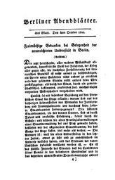| Keywords: Berliner Abendblätter 1810 015.jpg Berliner Abendblätter Berlin Julius Eduard Hitzig Berliner_Abendblätter_1810_ jpg 014 016 http //www presse uni-wuerzburg de/einblick/abendblaetter/ 1810-1811 Heinrich von Kleist Author died more than 70 years ago - public domain PD-old-100 Berliner Abendblätter |