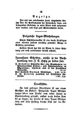 | Keywords: Berliner Abendblätter 1810 038.jpg Berliner Abendblätter Berlin Julius Eduard Hitzig Berliner_Abendblätter_1810_ jpg 037 039 http //www presse uni-wuerzburg de/einblick/abendblaetter/ 1810-1811 Heinrich von Kleist Author died more than 70 years ago - public domain PD-old-100 Berliner Abendblätter |