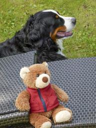 Keywords: bernese mountain dog sitting canine pet human friendly animal mammal teddy bear toy