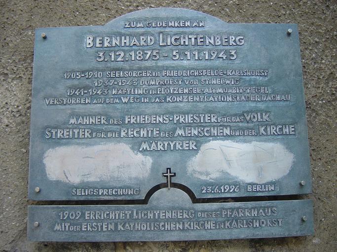 Keywords: Bernhard Lichtenberg Gedenktafel.jpg Gedenktafel für Bernhard Lichtenberg an dem von ihm errichteten Pfarrhaus in Berlin-Karlshorst Gundelfinger Straße 36 Memorial tablet for Bernhard Lichtenberg at the rectory built by him in Berlin-Karlshorst Gundelfinger Straße 36 Памятная доска в честь Бе нха да Лихтенбе га находящаяся на стене пост оенного им пасто ского дома в Бе лине-Ка лсхо сте Гундельфинге Шт ассе 36 Eigene Aufnahme Own photograph Собственная фотог афия 2007-08-07 Anton Huttenlocher Huttenlocher 52 29 17 N 13 31 29 E Antifascists from Germany Saints of Germany Christian martyrs Plaques in Berlin-Karlshorst Bernhard Lichtenberg |