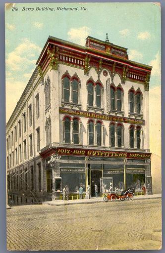 Keywords: vcu libraries vculibraries vcu digital collections vcudigitalcollections photo border outdoor architecture building text city Description: The Berry Building (Home of O. H. Berry & Co. Richmond, Va.). This splendid building for many years past owned and occupied by the foremost clothiers of the entire south -- O.H. Berry & Company is not only a delight to the eye from the exterior but is one of the handsomest and best appointed buildings inside -- for the conduct of a high-class clothing business such as is done by this firm -- to be found anywhere in this country. Unsurpassed facilities and unsurpassable clothing is the slogan of the Berry Store. Manufacturer: O.H. Berry & Co. Date Postmarked: 1910 Rights: This item is in the public domain. Acknowledgement of the Virginia Commonwealth University Libraries as a source is requested. Reference URL: dig.library.vcu.edu/u?/postcard,586 Collection: Rarely Seen Richmond: Early twentieth century Richmond as seen through vintage postcards Description: The Berry Building (Home of O. H. Berry & Co. Richmond, Va.). This splendid building for many years past owned and occupied by the foremost clothiers of the entire south -- O.H. Berry & Company is not only a delight to the eye from the exterior but is one of the handsomest and best appointed buildings inside -- for the conduct of a high-class clothing business such as is done by this firm -- to be found anywhere in this country. Unsurpassed facilities and unsurpassable clothing is the slogan of the Berry Store. Manufacturer: O.H. Berry & Co. Date Postmarked: 1910 Rights: This item is in the public domain. Acknowledgement of the Virginia Commonwealth University Libraries as a source is requested. Reference URL: dig.library.vcu.edu/u?/postcard,586 Collection: Rarely Seen Richmond: Early twentieth century Richmond as seen through vintage postcards |