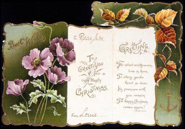 | Keywords: text writing document Shows mauve anemones on the left, and autumn leaves around the border, at right. In the centre is a short verse: Greeting: The sweet and gracious time is her / To every gentle heart so dear, / Its promise with you remain / Till happy Christmas comes again!. Quantity: 1 colour art print(s) on Christmas greetings card. Physical Description: Chromolithograph, on opened card, 142 x 205 mm.    Best wishes. To greet you for a right happy Christmas. [Card, open. 1900-1910?]. Various artists :[Box of assorted Christmas cards. 1860s-1919]. Ref: Eph-A-CARDS-Christmas-1900/1910-01-open. Alexander Turnbull Library, Wellington, New Zealand. natlib.govt.nz/records/23019551 Shows mauve anemones on the left, and autumn leaves around the border, at right. In the centre is a short verse: Greeting: The sweet and gracious time is her / To every gentle heart so dear, / Its promise with you remain / Till happy Christmas comes again!. Quantity: 1 colour art print(s) on Christmas greetings card. Physical Description: Chromolithograph, on opened card, 142 x 205 mm.    Best wishes. To greet you for a right happy Christmas. [Card, open. 1900-1910?]. Various artists :[Box of assorted Christmas cards. 1860s-1919]. Ref: Eph-A-CARDS-Christmas-1900/1910-01-open. Alexander Turnbull Library, Wellington, New Zealand. natlib.govt.nz/records/23019551 |