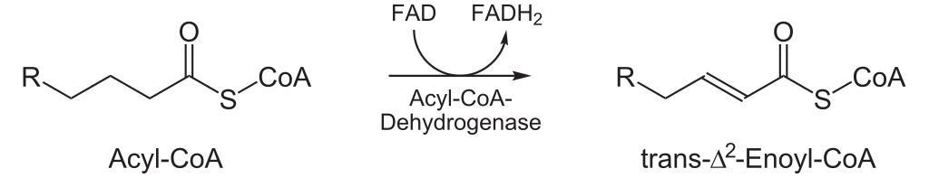 Keywords: Beta-Oxidation1.svg 1 Teilreaktion der Beta-Oxidation 1st step of beta oxidation own 2007-01-07 NEUROtiker Lipid metabolism Enzyme reactions