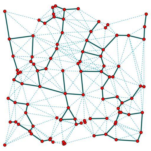 | Keywords: Beta-skeleton.svg β-skeletons of a set of 100 random points in a square The heavy dark edges are the β-skeleton for β 1 1 while the light dashed blue edges are the additional edges for β 0 9 own David Eppstein 2010-02-19 Source code This image was created with the following Python source code and then recolored and converted to SVG in Adobe Illustrator <source lang python > from pyx import canvas path color from math import from random import seed random seed 12345 npoints 100 radius 0 05 scale 5 beta1 1 1 beta2 0 9 theta1 asin 1/beta1 theta2 pi - asin beta2 points random scale random scale for i in range npoints def dot p q r return sum pi-ri qi-ri for i in 0 1 def sharp p q theta None for r in points if r not in p q prq acos dot p q r / dot p p r dot q q r 0 5 theta max theta prq return theta c canvas canvas def edge1 p q c stroke path line p0 p1 q0 q1 color rgb black def edge2 p q c stroke path line p0 p1 q0 q1 color rgb blue def point p c fill path circle p0 p1 radius color rgb red for p in points for q in points if p < q theta sharp p q if theta < theta1 edge1 p q elif theta < theta2 edge2 p q for p in points point p c writePDFfile Beta-skeleton </source> Computational geometry Files by User David Eppstein from en wikipedia Images with Python source code |