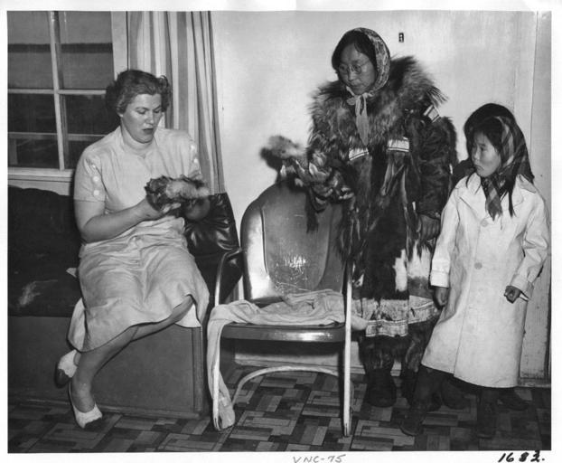 | Keywords: Bethel doll sellers FWS.jpg en Bethel Family Selling Dolls Yup'ik Eskimo woman and child with their fur dolls which they offer for sale at the Bethel Roadhouse The mother is in traditional clothing Both are wearing traditional scarves but the girl's coat is of modern style for the period There appears to be a second child behind the girl not mentioned in the FWS caption FWS keywords Villages Wildlife refuges Yukon Delta National Wildlife Refuge YUDE Native Americans Crafts Sewing ARLIS Alaska U S Fish and Wildlife Service The Pribilof Report 1949 Source FWS-1683 Public domain US Fish and Wildlife Service National Digital Library http //www fws gov/digitalmedia/cdm4/item_viewer php CISOROOT /natdiglib CISOPTR 3831 CISOBOX 1 REC 2 Haddon E P 1949-09-01 Consent published PD-USGov Bethel Alaska Yupik 1949 in Alaska History of tourism in Alaska Fur clothing of Inuit people Fur figures Dolls Photographs taken on 1949-09-01 Yukon Delta National Wildlife Refuge Fur fashion in 1949 |