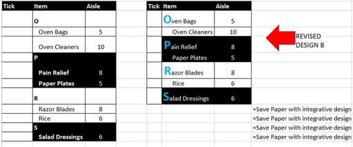 MAKE A MEME View Large Image Which aisle guide design is clearer and ergonomic? current design of supermarket or my proposed design using simple MS EXCEL software. Optional: use color theory to make the "O" or "P" (leading alphabet) to be of a ...