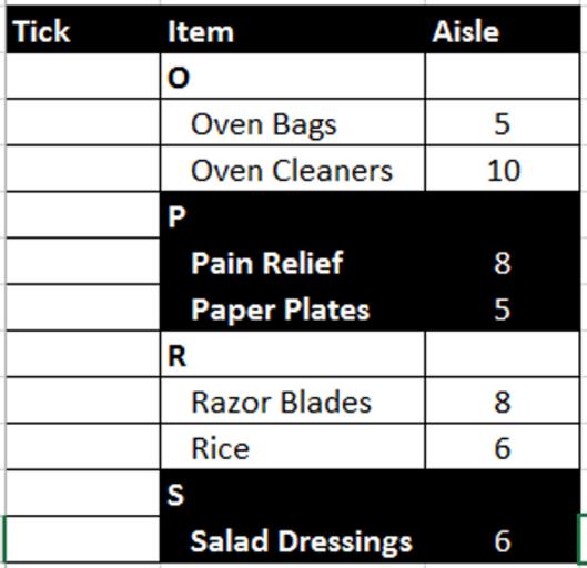 Keywords: Which aisle guide design is clearer and ergonomic? current design of supermarket or my proposed design using simple MS EXCEL software. Optional: use color theory to make the "O" or "P" (leading alphabet) to be of a different colour than the product name but contrast well with the background. Are there instructions to instruct customers to circle the product name that they want to buy on the brochure, and to write and group the aisle no. that they need to go to in a white space on the brochure? Are there instruction to encourage customers to bring the brochure home for them to plan ahead instead of wasting paper to write their own grocery list? --------------------------------------------------------------------------------- Revised design part 2 to save printing and paper cost if this brochure idea to be implemented globally: retail melbourne australia