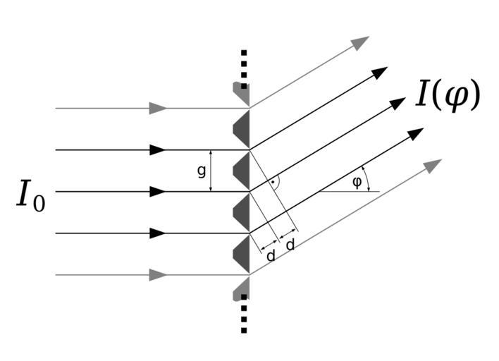 | Keywords: Beugungsgitter.svg  de de Beugung Physik Beugung am optischen Transmissionsgitter Wenn der Gangunterschied d zwischen zwei benachbarten Einzelspalten ein Vielfaches der Wellenlänge beträgt ergibt sich in dieser Richtung ein Intensitätsmaximum g Gitterkonstante <math>d_ max g \cdot sin \varphi n \cdot \lambda n \in \Z</math><br /> en en Diffraction Transmission grid diffraction If the path difference d between two neighbouring single slits amounts to a multiple of the wavelength this direction will lead to an intensity maximum g grid constant <math>d_ max g \cdot sin \varphi n \cdot \lambda n \in \Z</math> Own Biezl Grating condition svg Inkscape Transmission gratings |