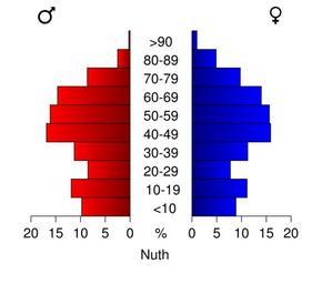| Keywords: Bevolkingspiramide 2008 - CBS gemeentecode 0951.svg Age pyramids for the municipalities in the Netherlands 1/1/2008 Created in svg with own script Statistics provided by Centraal Bureau voor de Statistiek Voorburg/Heerlen Source Tabel Bevolking; burgerlijke staat geslacht leeftijd en regio 1 januari Tabeltoelichting Gewijzigd op 14 mei 2008 Verschijningsfrequentie per jaar http //statline cbs nl/StatWeb/publication/default aspx DM SLNL PA 03759NED D1 1-2 2c15 D2 118-128 D3 1-4 2c8-9 2c13-19 2c21 2c24 2c26 2c28-30 2c33-36 2c38-40 2c43-44 2c48-49 2c52 2c54 2c56 2c59 2c62 2c64 2c67-71 2c78 2c80-84 2c86-89 2c91 2c93-98 2c101 2c103-107 2c109 2c111-112 2c115 2c118-119 2c121-124 2c126-127 2c130 2c132-134 2c136 2c138-141 2c143-144 2c146 2c151 2c154 2c156-157 2c159-160 2c162-163 2c166-167 2c169 2c171 2c177-179 2c181-182 2c184 2c187-189 2c191-195 2c198 2c201 2c204-205 2c207 2c209 2c211 2c214 2c218-219 2c221-224 2c226 2c228-230 2c233 2c236 2c241-243 2c246-251 2c253 2c257-262 2c265 2c271-274 2c276 2c278 2c282 2c284 2c286-290 2c292 2c294 2c296 2c298-299 2c301-303 2c306 2c312-314 2c317-318 2c321-322 2c327 2c329 2c332 2c334-335 2c337 2c339 2c344-346 2c349-353 2c355-358 2c361 2c363-366 2c368 2c370-373 2c380 2c382-383 2c386-391 2c393-395 2c399 2c403-406 2c408-409 2c412 2c416-417 2c419 2c421-422 2c424 2c426-430 2c432-433 2c439-441 2c447-448 2c450-452 2c455-456 2c458-459 2c462-463 2c465 2c468-469 2c471 2c476 2c478-479 2c481-482 2c484-486 2c489 2c491-492 2c496 2c498-500 2c503 2c505-507 2c512-516 2c519-521 2c523-524 2c528-532 2c534 2c536 2c540 2c542-543 2c546-550 2c552-555 2c560-561 2c564-565 2c567-568 2c572-573 2c577-580 2c586 2c588-594 2c597 2c599-603 2c605 2c609-610 2c612-614 2c617 2c619 2c621-624 2c628 2c630-631 2c633 2c636-637 2c640 2c646-647 2c649-651 2c653 2c655-661 2c663-664 2c666 2c668-670 2c673 2c675-681 2c683-684 2c686 2c689-690 2c693 2c695-696 2c698 2c701-702 2c706-710 2c717 2c719 2c721-722 2c724-725 2c727 2c732-733 2c735-742 2c746 2c750-752 2c756-757 2c759 2c761 2c763-764 2c766-769 2c771-772 2c774-775 2c777 2c779 2c783 2c785-788 2c791-793 2c796-797 D4 l HDR T STB G1 2cG2 2cG3 VW D StatLine own work using CBS data 2009-01 Michiel1972 Own work all rights released Public domain Population pyramids of municipalities of the Netherlands 2008 |
