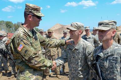 | Keywords: Brig. Gen. William Edwards, the Oregon Army National Guard's Land Component Commander, gives his coin to Soldiers from Bravo Company, 3rd Battalion, 116th Cavalry Brigade Combat Team, during exercise Saber Guardian 2016, August 5 at the Romanian Land Forces Combat Training Center in Cincu, Romania. Saber Guardian is a multinational military exercise involving approximately 2,800 military personnel from ten nations including Armenia, Azerbaijan, Bulgaria, Canada, Georgia, Moldova, Poland, Romania, Ukraine and the U.S. The objectives of this exercise are to build multinational, regional and joint partnership capacity by enhancing military relationships, exchanging professional experiences, and improving interoperability between the land forces from the participating countries. (U.S. Army photo by Sgt. Tyler Meister, 115th Mobile Public Affairs Detachment) Brig. Gen. William Edwards, the Oregon Army National Guard's Land Component Commander, gives his coin to Soldiers from Bravo Company, 3rd Battalion, 116th Cavalry Brigade Combat Team, during exercise Saber Guardian 2016, August 5 at the Romanian Land Forces Combat Training Center in Cincu, Romania. Saber Guardian is a multinational military exercise involving approximately 2,800 military personnel from ten nations including Armenia, Azerbaijan, Bulgaria, Canada, Georgia, Moldova, Poland, Romania, Ukraine and the U.S. The objectives of this exercise are to build multinational, regional and joint partnership capacity by enhancing military relationships, exchanging professional experiences, and improving interoperability between the land forces from the participating countries. (U.S. Army photo by Sgt. Tyler Meister, 115th Mobile Public Affairs Detachment) |
