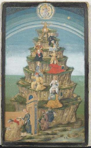 | Keywords: photo border Firenze. 20x10 cm. Chantilly, Musée Condé. DANSK/ENGLISH: "Denne florentinske miniature placerer de kvindelige personifikationer af de syv frie kunster på en stejl bjergsti. Motivet understreger, at beherskelse af de frie kunster er hårdt arbejde; studerende skal forcere en stejl bakke for at nå toppen for al viden om dette. I denne historiske fase var målet for de frie kunster en forberedelse til studiet af teologi, og det er den allegoriske figur Teologia, vi ser her på bjergtop på baggrund af de planetariske sfærer, pegende op mod Gud. Nedenfor hende ses hver af personifikationerne med attribut og en historisk figur berømt for udøvelsen af relevante kunst. Ved porten til bjerget ledsages Grammatica ledsaget af den romerske grammatiker Donatus (4. århundrede e.Kr.). Med dem er de to små drenge, der ofte fungerer som Grammaticas attributter. Dernæst ses Aritmetica, som tæller sivene langs bjergsiden og ledsages af Pythagoras (6. århundrede f.Kr.). Logica følger, holder en skorpion som attribut og ledsages af filosoffen Zeno (5. århundrede f.Kr.). Efter Logica kommer Musica, med et lille orgel på skøddet og ledsages af den bibelske musiker Tubalkain, som frembringer perfekte harmonier på sin ambolt (Første Mosebog 4:22). Astronomia følger Musica og holder en armillarsfære. Hun er ledsaget af den gamle alexandrinske astronom, Ptolemæus (2. århundrede e.Kr.). Efter Astronomia kommer Geometria, hvis attribut er en passer. Hun ledsages af Euklid (4. århundrede f.Kr.). Derpå følger Retorica er med en bog. Hun gestikulerer, som om hun holder en tale. Med hende er den romerske taler Cicero (1. århundrede f.Kr.). Teologia sidder på toppen af bjerget, iført en guldkjole. Hun holder et symbol på Treenigheden og er ledsaget af Sankt Thomas af Aquinas." www2.naz.edu/dept/philosophy/liberal-arts-resources/class... "This Florentine miniature situates the female personifications of the Seven Liberal Arts on an ascending mountain path. The arrangement emphasizes that mastery of the Liberal Arts is hard work; students must climb a steep hill in order to reach the summit of all knowledge. At this point in history, the goal of the Liberal Arts was preparation for the study of theology, and it is the allegorical figure of Theology we see here on the mountaintop against a background of the planetary spheres and pointing up toward God. Below her, each of the seven Liberal Arts appears with her identifying attribute and a historical figure famous for the practice of her Art. At the gateway to the mountain is Grammar accompanied by the Roman Grammarian Donatus (4th century AD). With them are the two small boys that often serve as Grammar’s attribute. Next is Arithmetic, counting the reeds along the mountainside and accompanied by Pythagoras (6th century BC). Logic follows, holding a scorpion and accompanied by the philosopher Zeno (5th century BC). After Logic comes Music, with a small organ on her lap and accompanied by the biblical musician Tubal Cain, who is sounding perfect harmonic proportions on his anvil (Genesis 4:22). Astronomy follows Music, holding an Armillary sphere and accompanied by the ancient Alexandrian astronomer, Ptolemy (2nd century AD). After Astronomy comes Geometry, who holds a compass and is accompanied by Euclid (4th century BC). Rhetoric is next, holding a book and gesturing as though she is making a speech. With her is the Roman orator Cicero (1st century BC). Theology is seated at the summit of the mountain, wearing a gold dress and holding a symbol of the Trinity. She is accompanied by St. Thomas Aquinas." www2.naz.edu/dept/philosophy/liberal-arts-resources/class... Firenze. 20x10 cm. Chantilly, Musée Condé. DANSK/ENGLISH: "Denne florentinske miniature placerer de kvindelige personifikationer af de syv frie kunster på en stejl bjergsti. Motivet understreger, at beherskelse af de frie kunster er hårdt arbejde; studerende skal forcere en stejl bakke for at nå toppen for al viden om dette. I denne historiske fase var målet for de frie kunster en forberedelse til studiet af teologi, og det er den allegoriske figur Teologia, vi ser her på bjergtop på baggrund af de planetariske sfærer, pegende op mod Gud. Nedenfor hende ses hver af personifikationerne med attribut og en historisk figur berømt for udøvelsen af relevante kunst. Ved porten til bjerget ledsages Grammatica ledsaget af den romerske grammatiker Donatus (4. århundrede e.Kr.). Med dem er de to små drenge, der ofte fungerer som Grammaticas attributter. Dernæst ses Aritmetica, som tæller sivene langs bjergsiden og ledsages af Pythagoras (6. århundrede f.Kr.). Logica følger, holder en skorpion som attribut og ledsages af filosoffen Zeno (5. århundrede f.Kr.). Efter Logica kommer Musica, med et lille orgel på skøddet og ledsages af den bibelske musiker Tubalkain, som frembringer perfekte harmonier på sin ambolt (Første Mosebog 4:22). Astronomia følger Musica og holder en armillarsfære. Hun er ledsaget af den gamle alexandrinske astronom, Ptolemæus (2. århundrede e.Kr.). Efter Astronomia kommer Geometria, hvis attribut er en passer. Hun ledsages af Euklid (4. århundrede f.Kr.). Derpå følger Retorica er med en bog. Hun gestikulerer, som om hun holder en tale. Med hende er den romerske taler Cicero (1. århundrede f.Kr.). Teologia sidder på toppen af bjerget, iført en guldkjole. Hun holder et symbol på Treenigheden og er ledsaget af Sankt Thomas af Aquinas." www2.naz.edu/dept/philosophy/liberal-arts-resources/class... "This Florentine miniature situates the female personifications of the Seven Liberal Arts on an ascending mountain path. The arrangement emphasizes that mastery of the Liberal Arts is hard work; students must climb a steep hill in order to reach the summit of all knowledge. At this point in history, the goal of the Liberal Arts was preparation for the study of theology, and it is the allegorical figure of Theology we see here on th