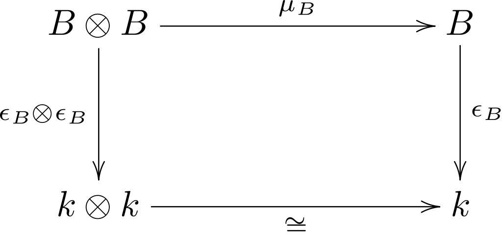 | Keywords: Bialgebra-mu-epsilon.svg Die Multiplikation <math>\mu_B</math> und Koeins <math>\epsilon_B</math> einer Bialgebra <math>B</math> müssen diese Kompatibilitätsbedingung erfüllen Own 2006-08-12 Markus Schmaus Public Domain Quelltext Siehe wikipedia de Benutzer Markus Schmaus/Kommutatives Diagramm <pre> latex \documentclassa4paper article \usepackagedvips matrix arrow ps color line curve frame xy \usepackage diagxye \thispagestyle empty \begin document \bfig \square<1000 500> B \otimes B` B` k \otimes k` k ; \mu_B` \epsilon_B \otimes \epsilon_B` \epsilon_B` \cong \efig \end document </pre> Commutative diagrams of binary operations Commutative squares Images with LaTeX source code |