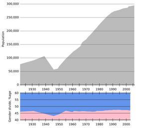 | Keywords: BiaÅ‚ystok population and gender composition.svg BiaÅ‚ystok's population 1921 “2006 and gender breakdown 1921 “2003 Own 2007-06-16 El T Created with Text Editor Source data Based on the following data from the English article Year Male Female Overall 1921 35384 41408 76792 1931 42416 48685 91101 1939 - - 107000 1946 24325 32434 56759 1949 - - 60330 1950 30253 38250 68503 1955 45454 51738 97192 1960 55439 65482 120921 1961 58432 67018 125450 1962 59922 68712 128634 1963 61394 70723 132117 1964 63240 73119 136359 1965 64880 75106 139986 1966 66979 77499 144478 1967 72923 83816 156739 1968 74777 86022 160799 1969 76648 88290 164938 1970 77890 90153 168043 1971 80569 93336 173905 1972 83243 96420 179663 1973 85391 99221 184612 1974 87803 102350 190153 1975 90386 105475 195861 1976 93075 108320 201395 1977 95770 111646 207416 1978 99009 113002 212011 1979 102133 116627 218760 1980 104722 119465 224187 1981 107176 122475 229651 1982 110027 125399 235426 1983 112552 127752 240304 1984 115292 130137 245429 1985 118016 132801 250817 1986 120536 135157 255693 1987 122587 136964 259551 1988 124757 139137 263894 1989 126649 141436 268085 1990 128279 142289 270568 1991 129740 143562 273302 1992 129997 144098 274095 1993 131035 145010 276045 1994 131624 145427 277051 1995 132175 146314 278489 1996 133036 147556 280592 1997 133727 148803 282530 1998 134230 149707 283937 1999 134745 150285 285030 2000 134905 150602 285507 2001 135335 151030 286365 2002 137350 154310 291660 2003 137288 154643 291931 2006 - - 295000 People of BiaÅ‚ystok SVG temporal graphs Temporal population graphs of Poland |