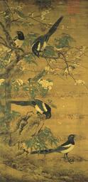 | Keywords: Bian Jingzhao-Four Magpies.jpg artwork creator Bian Jingzhao å››å– å – Four Magpies hanging scroll ; color silk cm 122 8 60 4 museum NPM http //tech2 npm gov tw/cheschool/zh-tw/index aspx content c_2_27 Early Ming Dynasty 1368 “1644 PD-old-100 Paintings in the National Palace Museum Bian Jingzhao Bird-and-flower paintings of China Pica pica in art Zhao Chang |