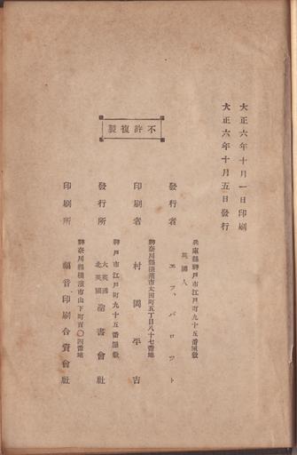 | Keywords: Bible JRV colophon.png ja いわゆる大正改訳新約聖書の 版(大英国・北英国聖書会社版) 改訳 新約聖書 1917年(大正6年)10 発行 奥付 en The New Testament Japanese Revised Version Taishô-kaiyaku British Foreign Bible Society Japan Agency Kobe 1917 Colophon 2016-04-10 自身の蔵書からスキャン sumaru other versions PD-old-70-1923 Japanese bibles |