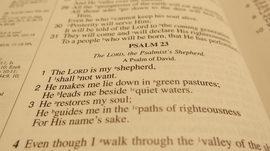 Keywords: bible scripture psalm psalm 23 christian religion holy book book spiritual faith text god old testament open page