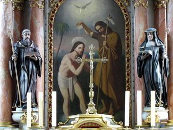 | Keywords: Biblisheim StJeanBaptiste 06.JPG Alsace Bas-Rhin Biblisheim Église Saint-Jean-Baptiste Maître-autel 1724 Tableau Baptême du Christ Statues de St-Benoît et Ste-Scholastique XVIIIe own 2012 Ralph Hammann cc-by-sa-3 0 Artwork / Œuvre d'art / Kunstwerk oil canvas cm Eglise Saint Jean-Baptiste Biblisheim Maître-autel IM67011863 IM67011864 object history Les tableaux du retable ont été remplacés au 19e siècle le maître-autel datant du 1er quart du 18e siècle Le tableau du couronnement est signé Sorg sur le pied du prie-dieu de la Vierge le prénom étant illisible Il pourrait dater du milieu du 19e siècle Le tableau du retable est également signé angle inférieur gauche mais la signature n'a pas pu être déchiffrée Il pourrait s'agir d'une oeuvre de Carola Sorg dans la 2e moitié du 19e siècle other versions Ralph Hammann PD-old accession number Maître-autel de l'église Saint-Jean-Baptiste de Biblisheim Photographs of Biblisheim by Ralph Hammann Religious statues in Bas-Rhin Wooden statues in Bas-Rhin Baroque statues in Bas-Rhin 18th-century statues in Alsace 1724 statues in France Statues of Christian saints in Alsace Statues of Saint Benedict of Nurcia in France Statues of Saint Scholastica in France Altar crosses in Bas-Rhin Church paintings in Bas-Rhin 19th-century paintings of the baptism of Jesus Christ Taken with Canon PowerShot SX20 IS Paintings of the baptism of Jesus Christ in France |