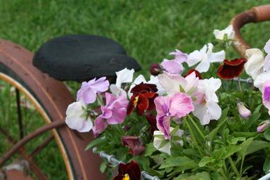 Keywords: bicycle basket flowers pansies lawn landscape vintage