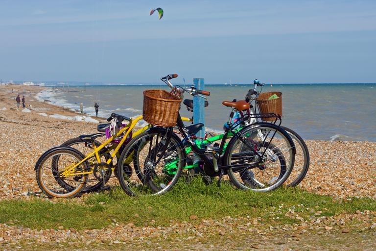 Keywords: bicycles bicycle bike bikes parked seaside sea ocean coast beach coastal blue sky water transport transportation outdoors image photo