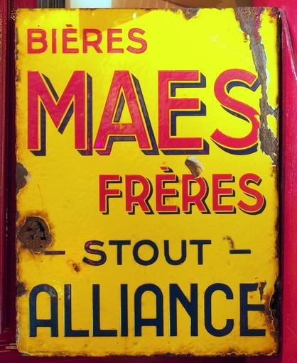 | Keywords: Bières Maes Frères Stout Alliance enamel advertising signs.JPG Photographed at the Bierreclame Museum Haagweg Breda The Netherlands Very old advertisment of a beer company that does not exist any more own 2014-11-16 13 53 46 Alf van Beem CC-zero Trademarked Bierreclame Museum Haagweg Enamel beer advertising signs |