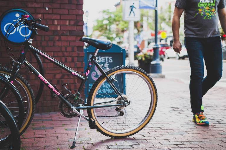 Keywords: bike bicycle urban parked pedestrian outdoor outside biking cycle leisure bike riding
