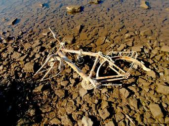 Keywords: bike bicycle wreck thrown away rusted wreck wheel scrap broken pollution disposed of environmental protection dirty clay weser water stones river