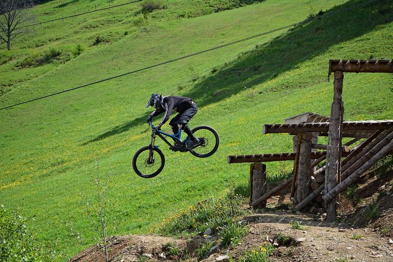 Keywords: bike human person sport bike park obstacle jump action out nature cycling hill bike route terrain trail riding in motion