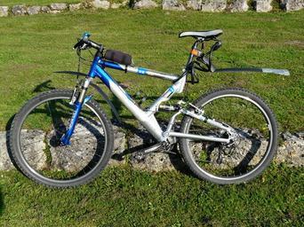 Keywords: bike mountain bike transport wheel cycling meadow lean on bike ride sun dry tour trip bicycles cycle suspension