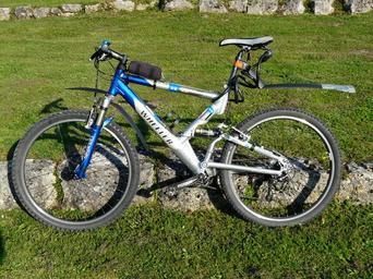 Keywords: bike mountain bike transport wheel cycling meadow lean on bike ride sun dry tour trip bicycles cycle suspension