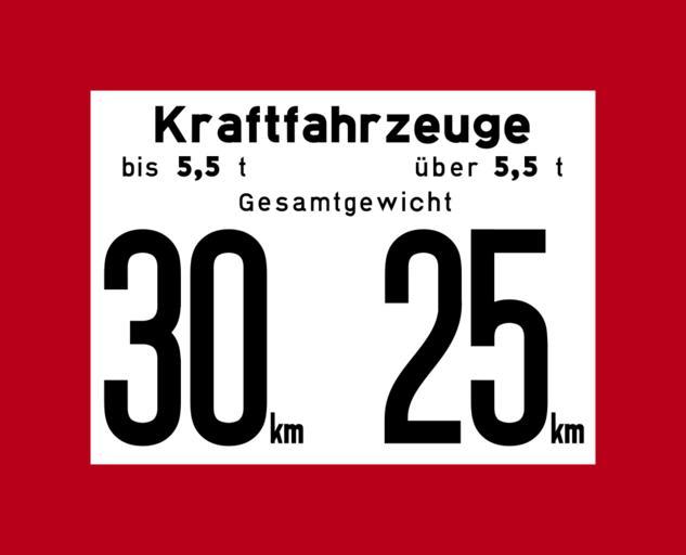 | Keywords: Bild 72 - Zeichen für Geschwindigkeitsbeschränkungen bis 5,5 t auf 30 km und über 5,5 t auf 25 km, StVO 1937.svg de Bild 72 Zeichen für Geschwindigkeitsbeschränkungen bis 5 5 t auf 30 km und über 5 5 t auf 25 km Deutsches Verkehrszeichen nach dem Reichsgesetzblatt 123 vom 16 November 1937 S 1213 Außerdem identisch in Reichsgesetzblatt Jahrgang 1934 Nr 112 Tag der Ausgabe Berlin 9 Oktober 1934 S 908 Das Zeichen findet sich zudem in der Berliner Straßenordnung vom 15 Januar 1929 Anlage IV own selbst gezeichnet von Mediatus Mediatus 14 November 2015 Herstellungsdatum Other fields + Signs Cc-zero PD-VzKat German language signs Square signs Location not applicable Diagrams of historic road signs of Germany 1929 set Diagrams of miscellaneous road signs of Germany 1934 set Diagrams of deprecated road signs of Germany 1938 set 71 SVG road signs in Germany |