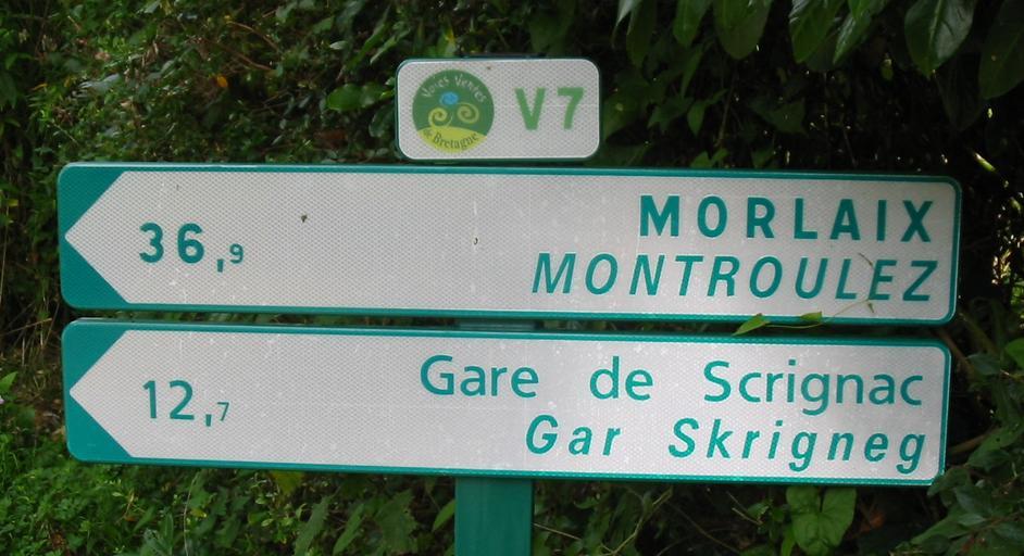 | Keywords: Bilingual cycle route sign to Morlaix.jpg Bilingual sign on cycle route along former railway from Carhaix to Morlaix Brittany Own 2007-08-17 Man vyi Bilingual Breton-French road signs Morlaix Cycling route signs in France Voie Verte de Morlaix à Carhaix-Plouguer |